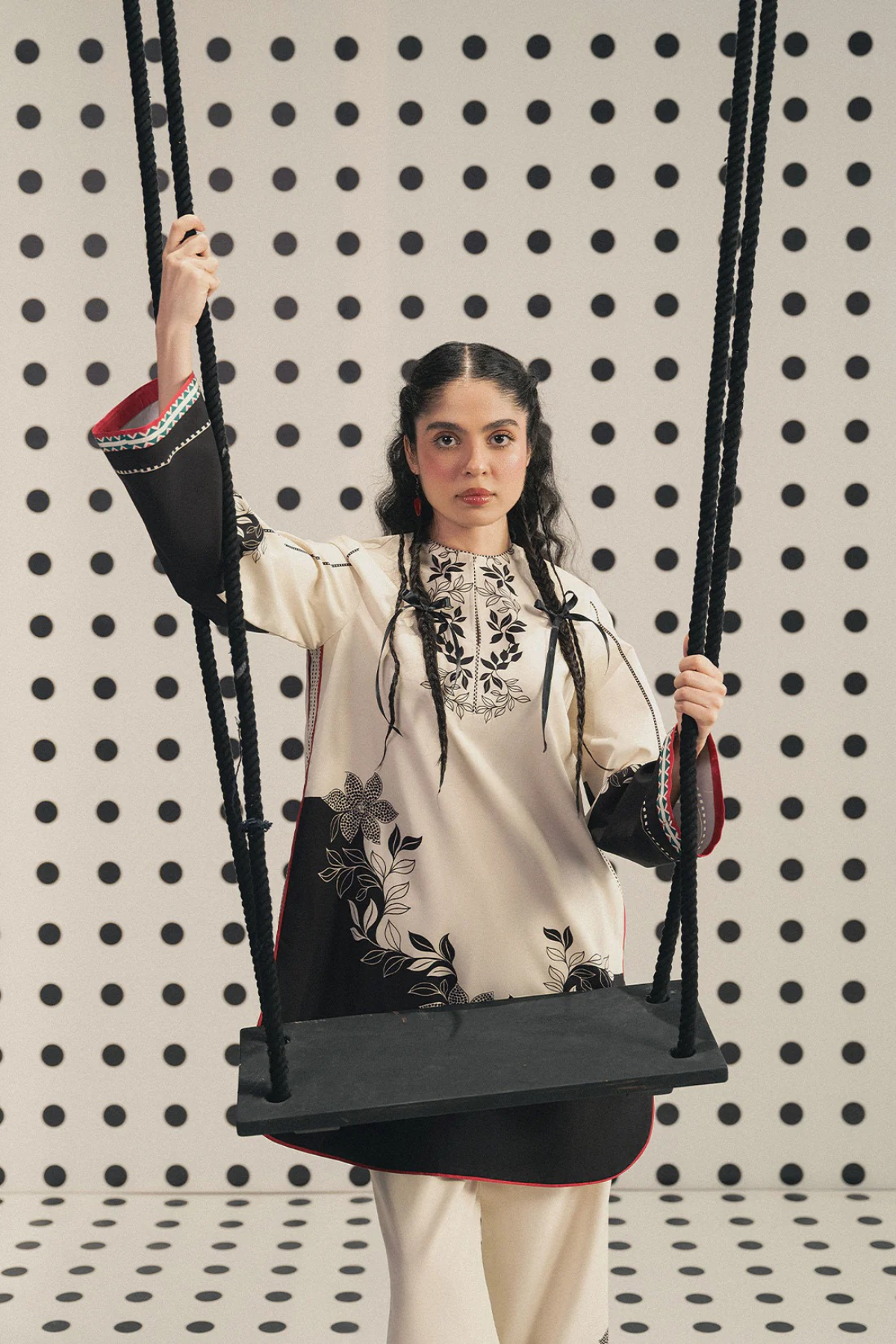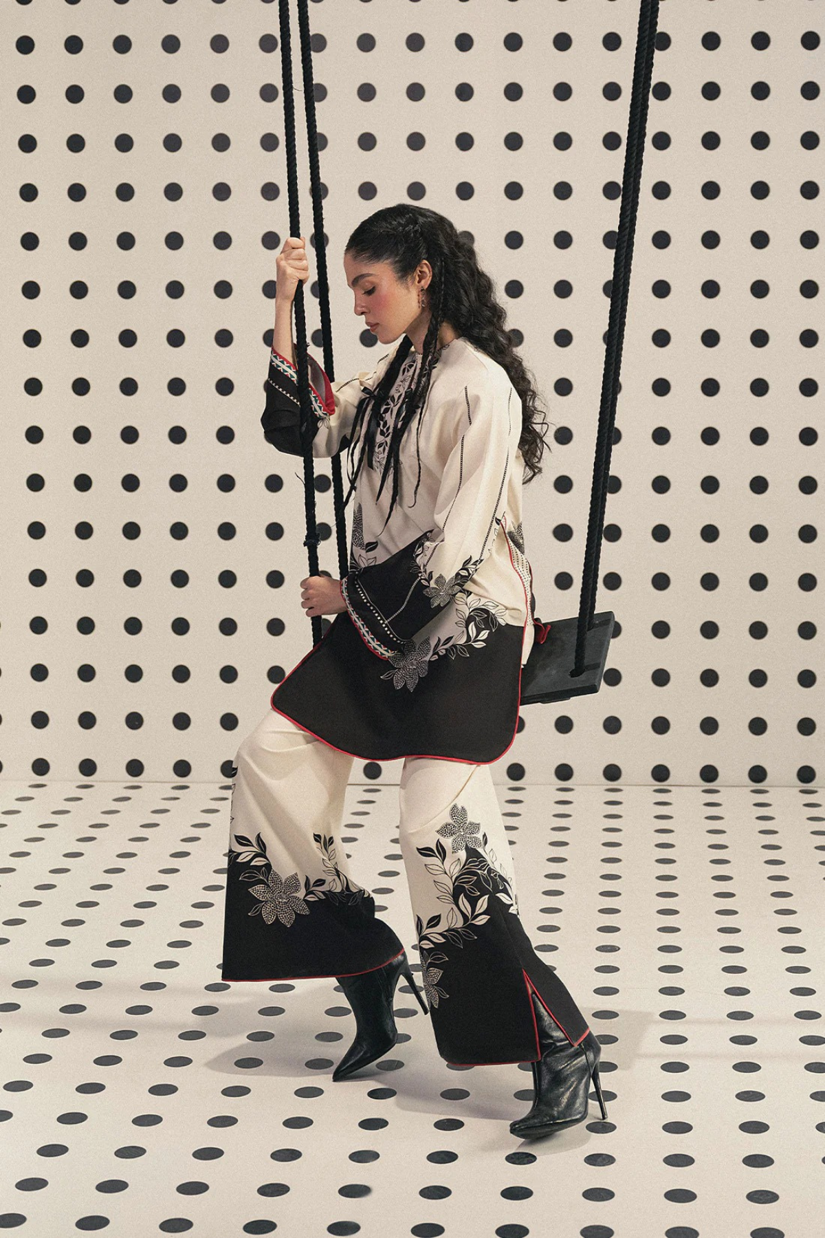 This ivory shirt-and-trouser set is defined by bold black panels accented with pointillist florals that collect along the sleeves, hem, and pant cuffs. The straight shirt keeps the silhouette clean and structured, while the matching trousers extend the same monochrome rhythm. A touch of red edging sharpens the finish, giving the look a refined, modern contrast