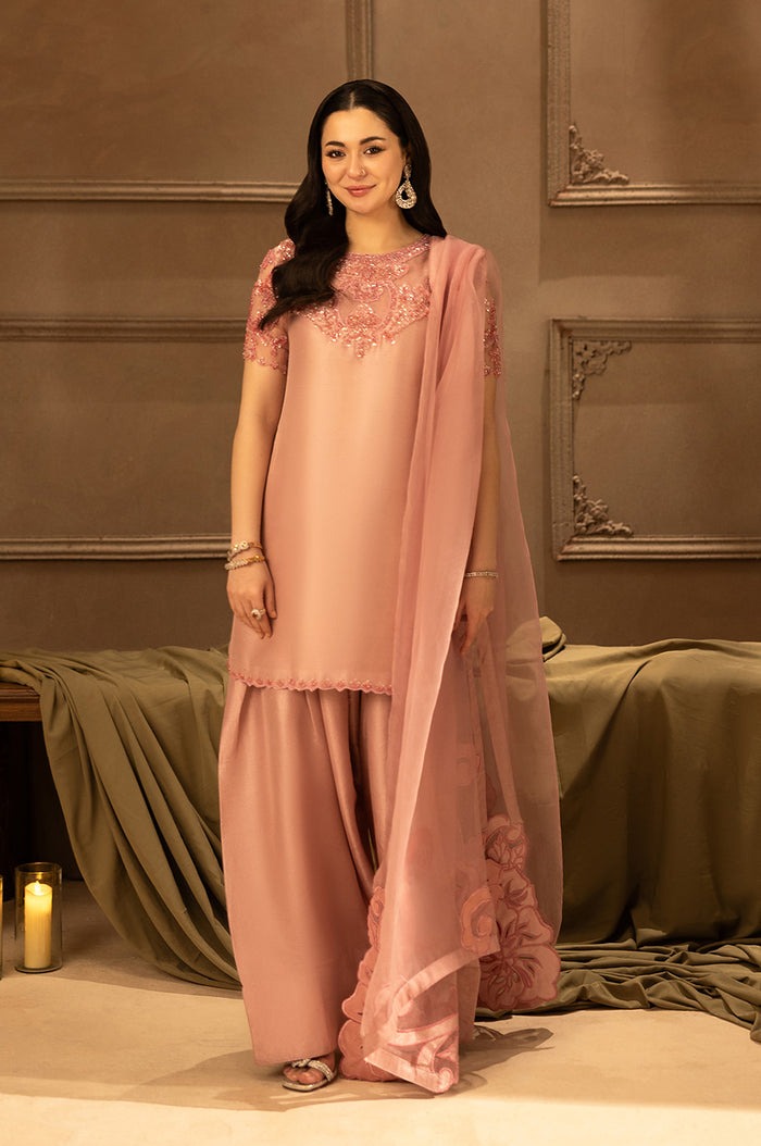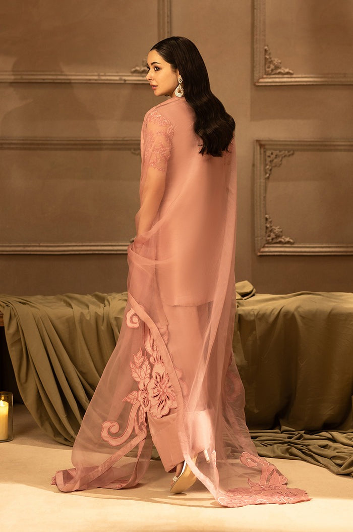 Soft as twilight and refined in every detail, Dusk captures the elegance of muted woven into luxurious Cotton. The neckline and sleeves shimmer with delicate 3D crystal embellishments, adding depth and sparkle without overpowering the look. Paired with a gracefully tailored farshi shalwar and a breezy organza dupatta, the ensemble strikes a perfect harmony between glamour and grace.