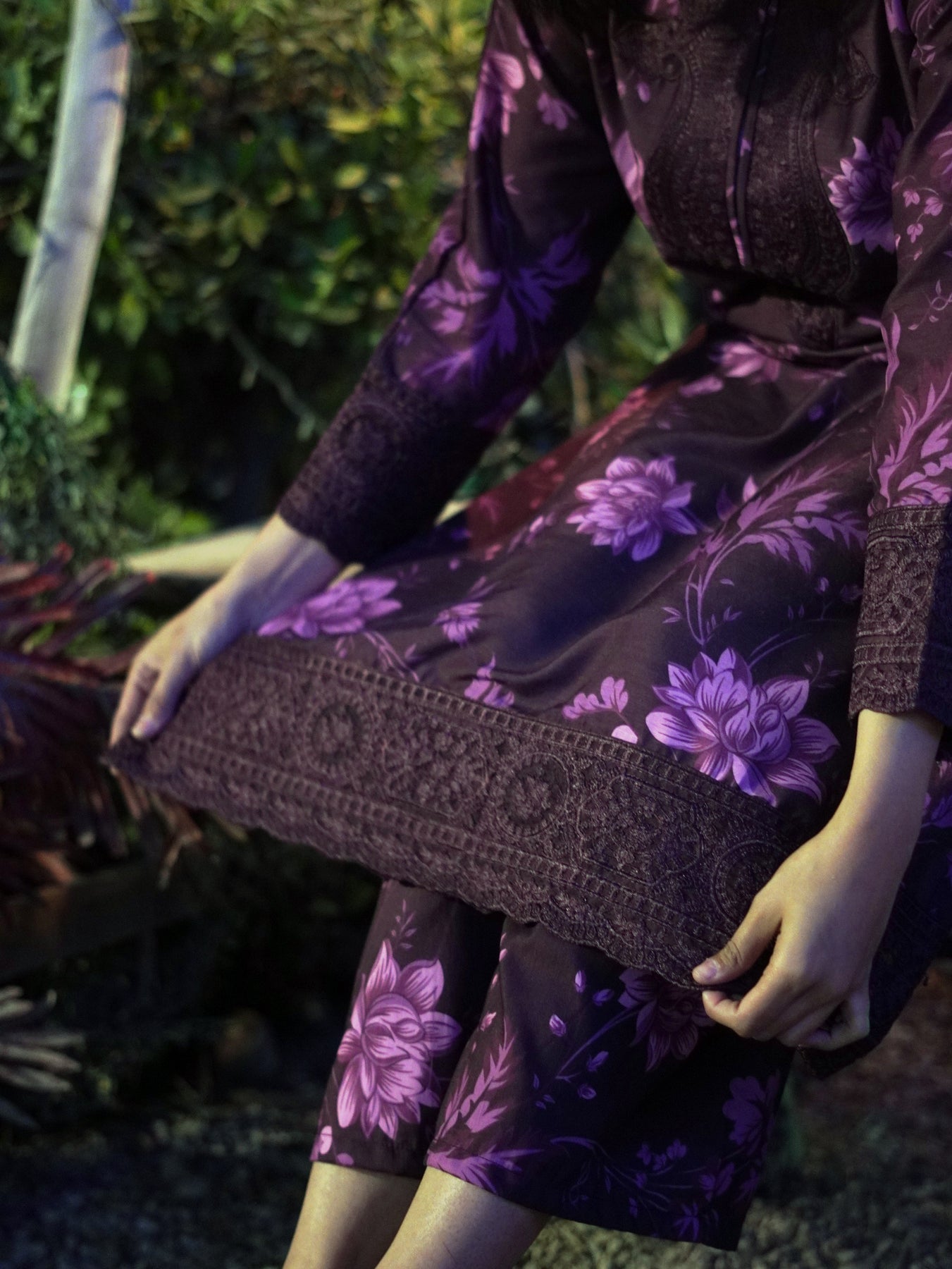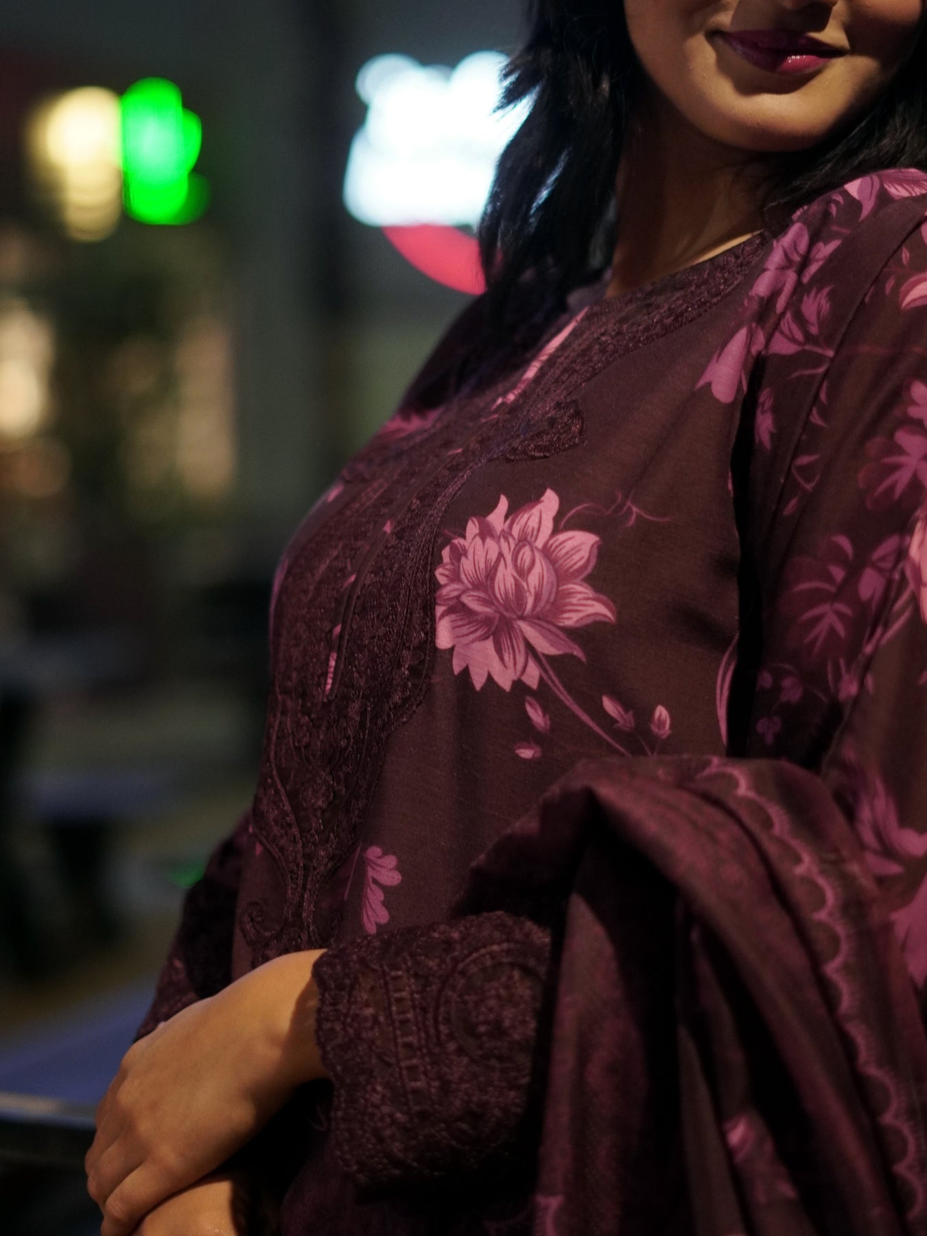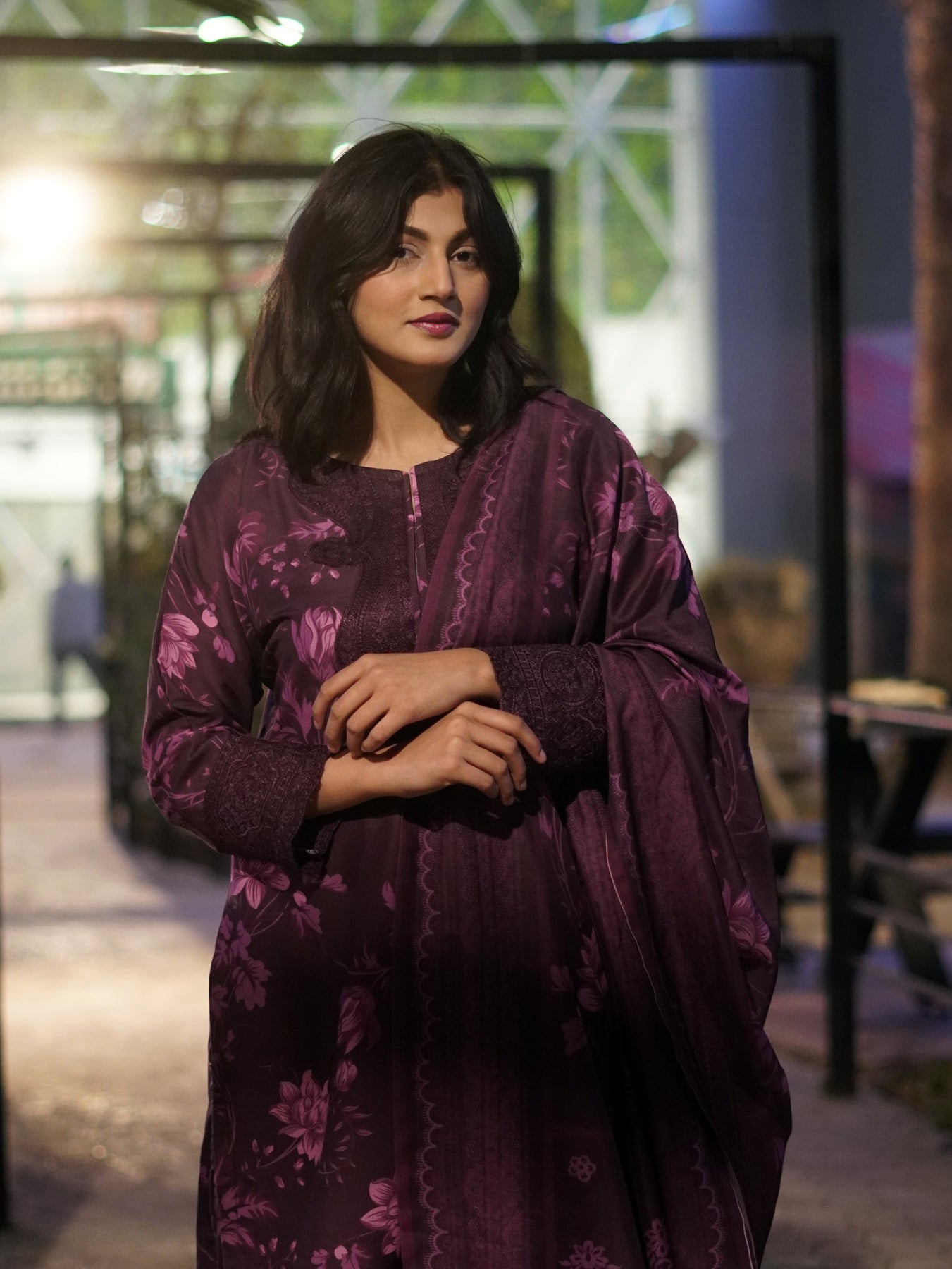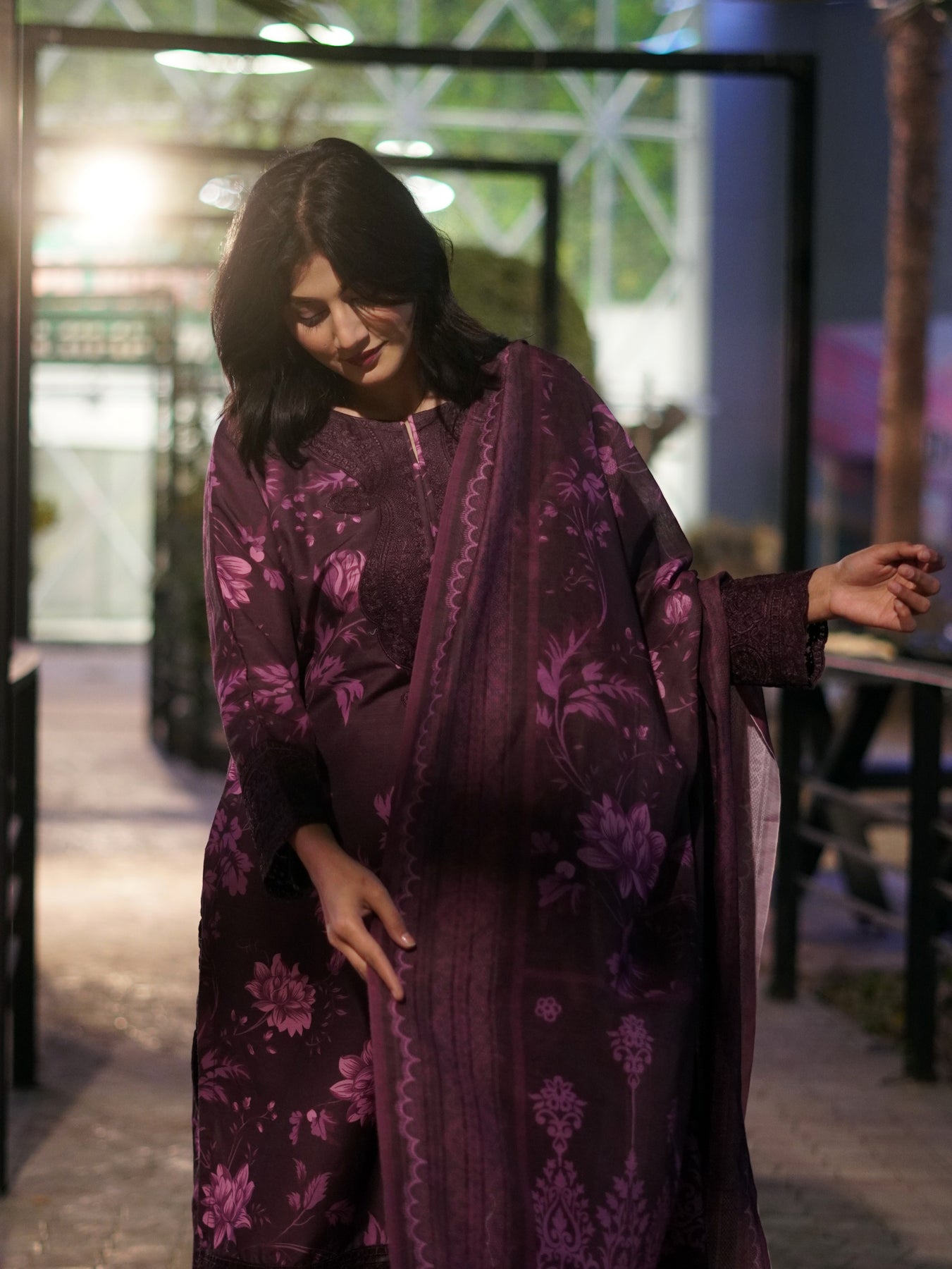 Step into effortless elegance with this beautifully crafted ensemble, designed in rich plum tones and adorned with soft floral artistry.