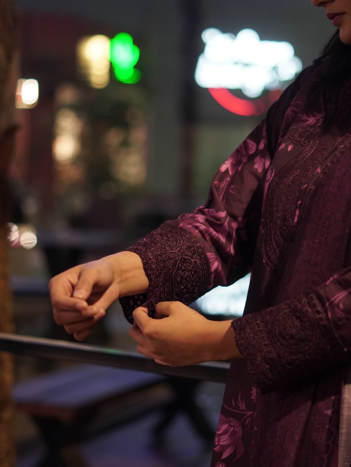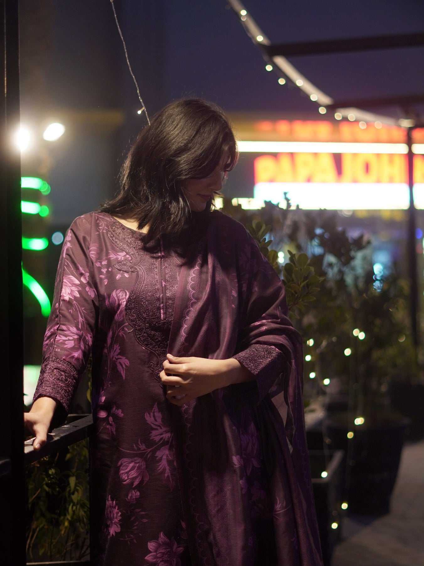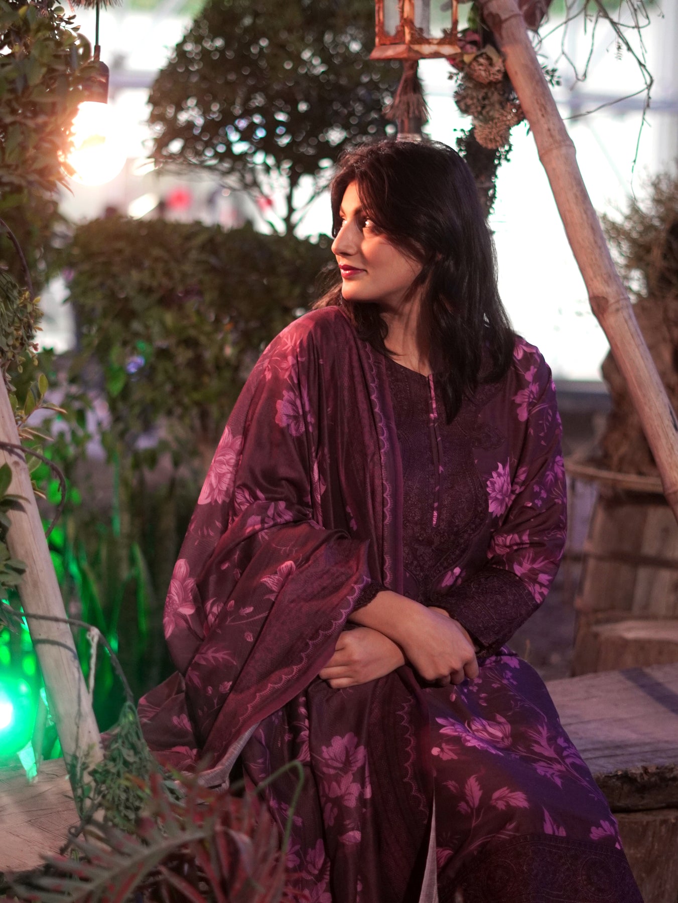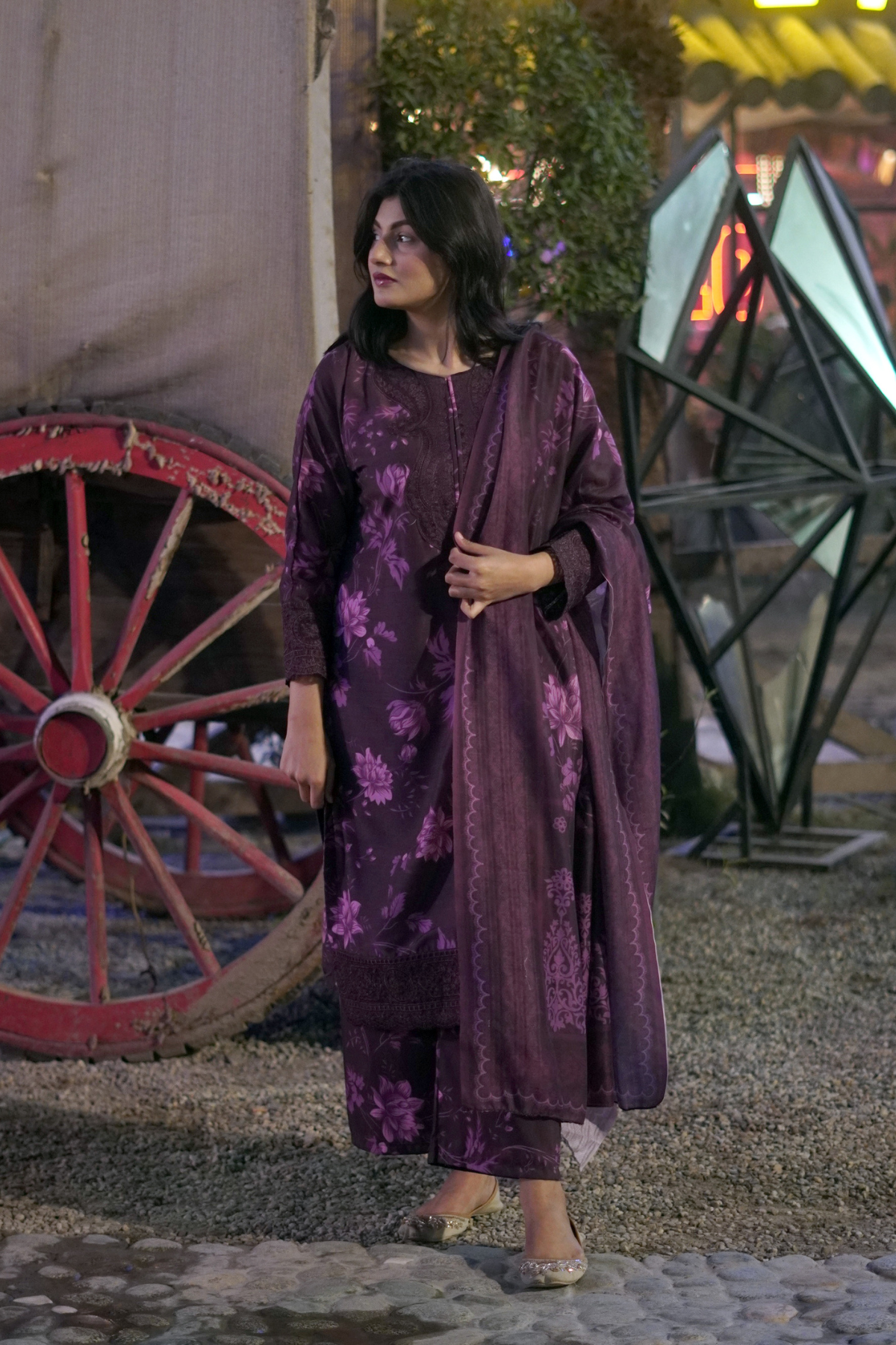 Step into effortless elegance with this beautifully crafted ensemble, designed in rich plum tones and adorned with soft floral artistry.