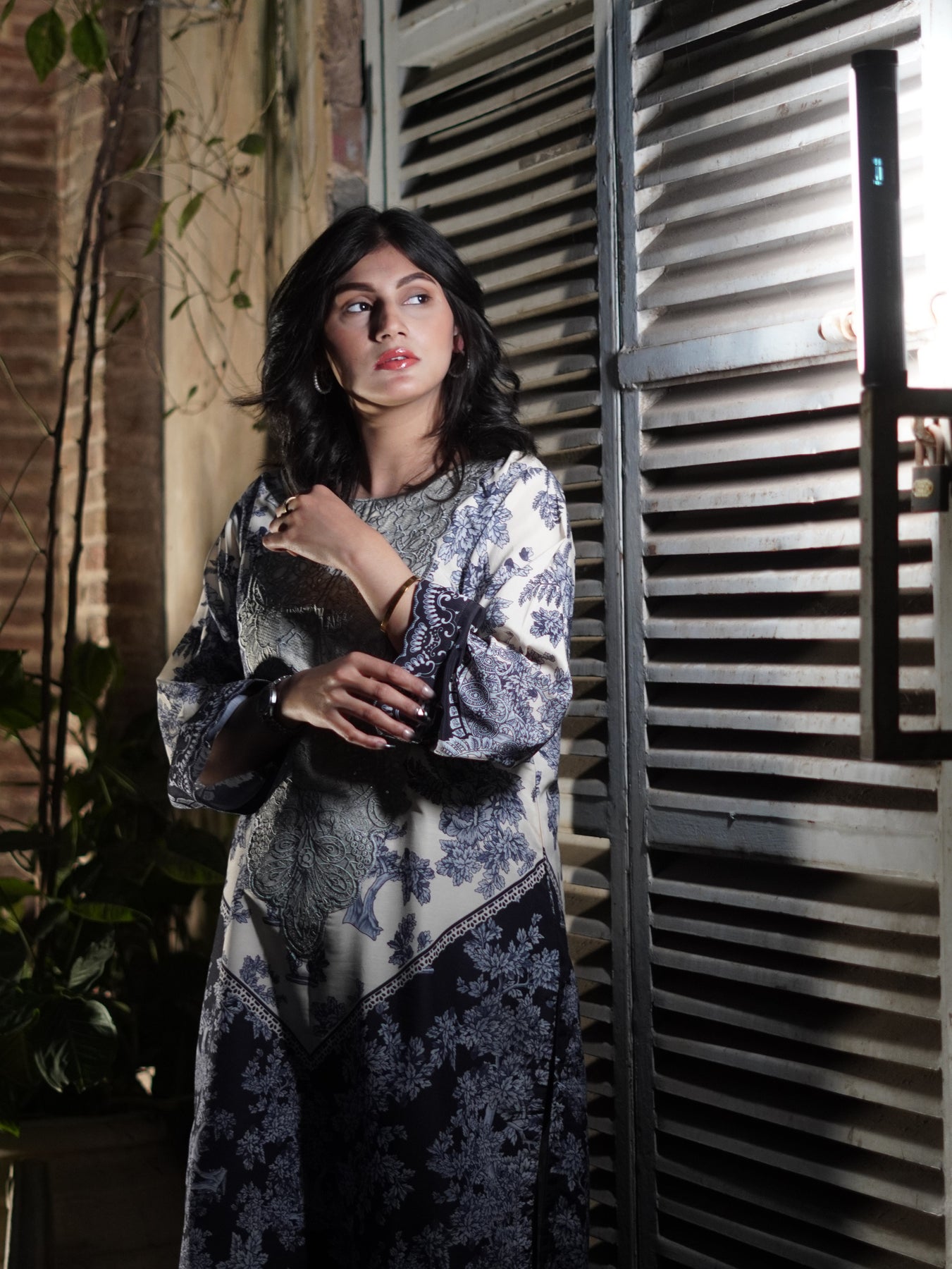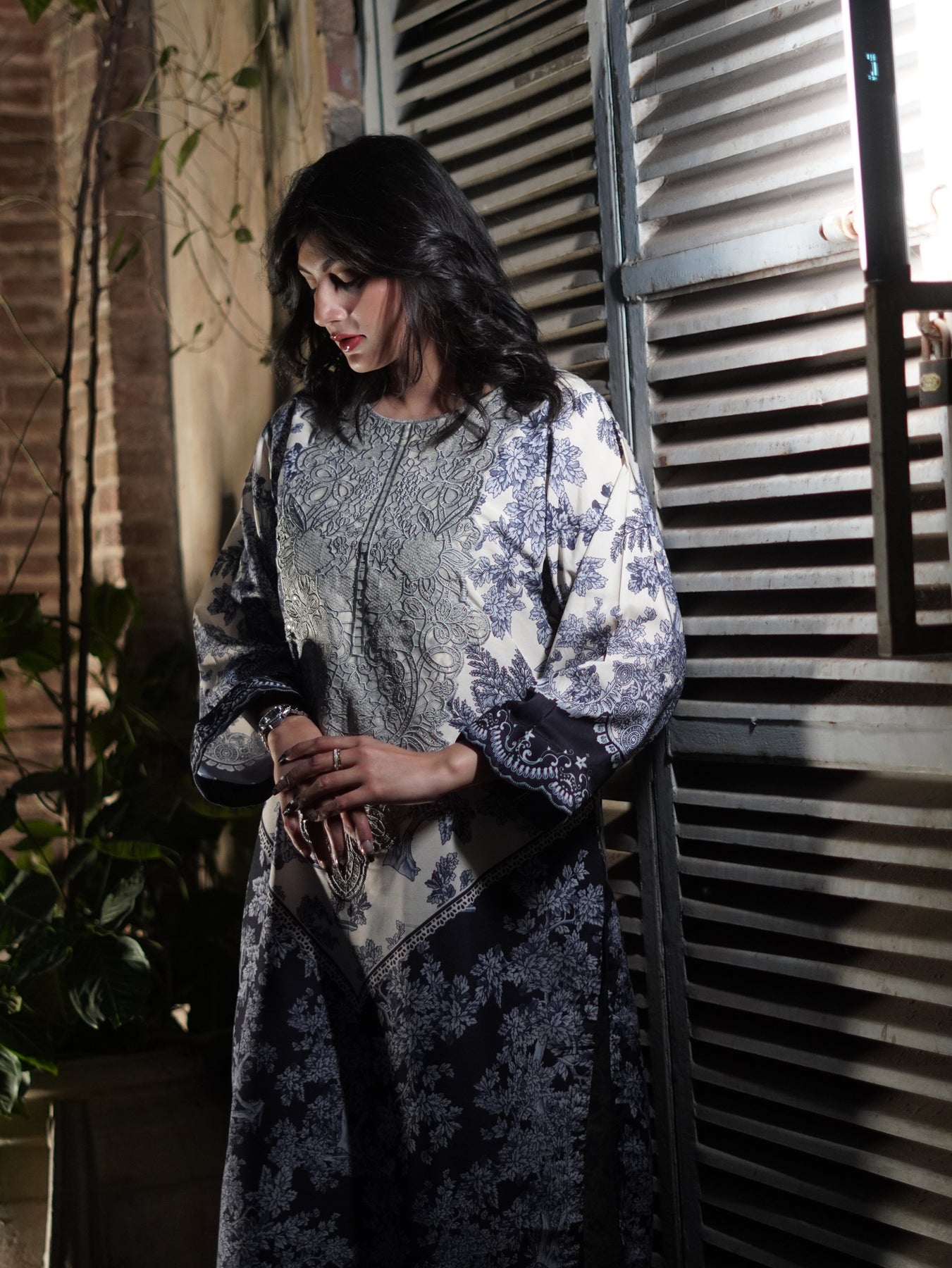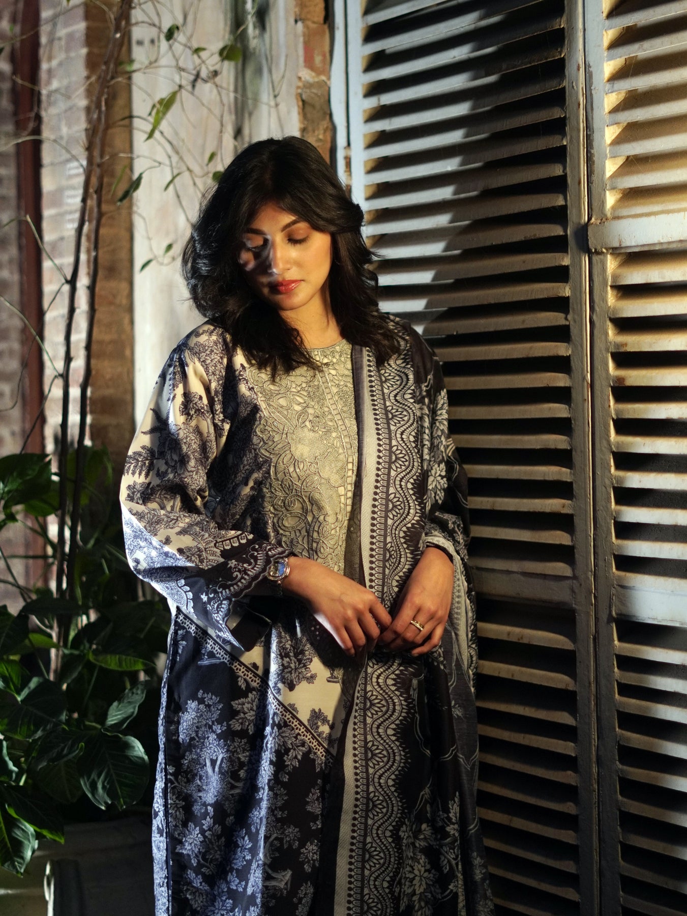 Experience refined tradition with this beautifully crafted ensemble, featuring intricate motifs in classic ivory and midnight shades.